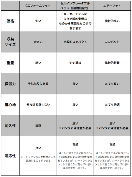各スリーピングパッドについて下の比較チャートを参考にしてみてください。