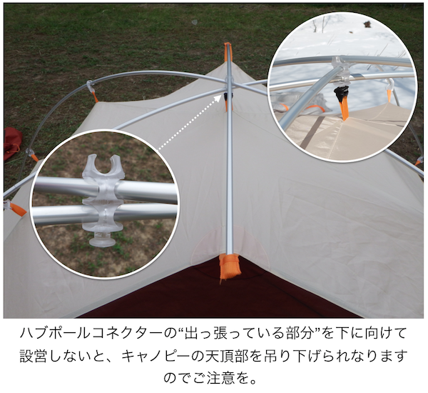 設営はシンプルでとても簡単。キャノピーは吊り下げ式で、クリップ(DAC社製)をポール引っ掛け、フライシートもバックルで固定するだけ。ハブポールシステムを採用しているので、ポール(ハブ)の上下さえ間違わなければあっという間に設営完了。