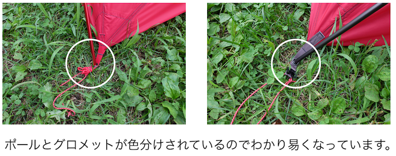 キャノピー用のポールの色が色分けされていて、設営するときに同じ色のグロメットに同 じ色のポールを入れるようになっているので間違えることはなさそうです。